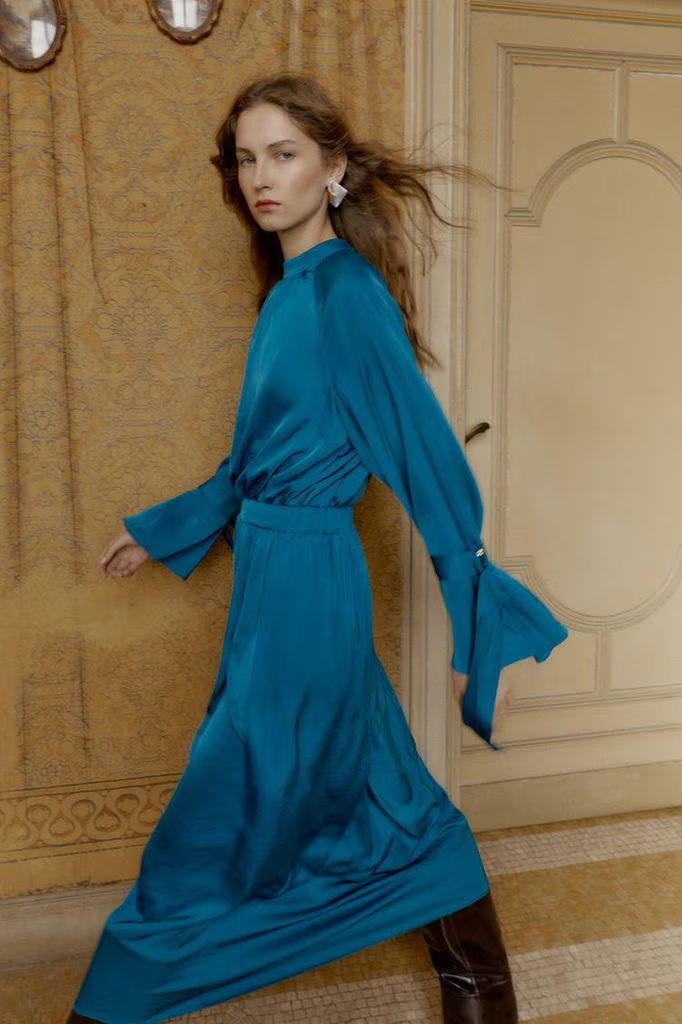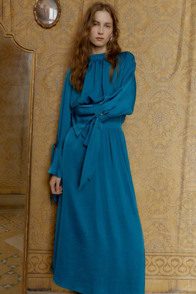 Como el anterior, este diseño destaca por el efecto satinado y por la manga larga, aunque aquí se ajusta al puño con lazadas originales que aportan movimiento. El cuerpo ablusonado, el cuello ligeramente subido y los drapeados evocan esos vestidos elegantes al estilo Halston de los años 70. Y el azul, por si fuera poco, suma aún más puntos.