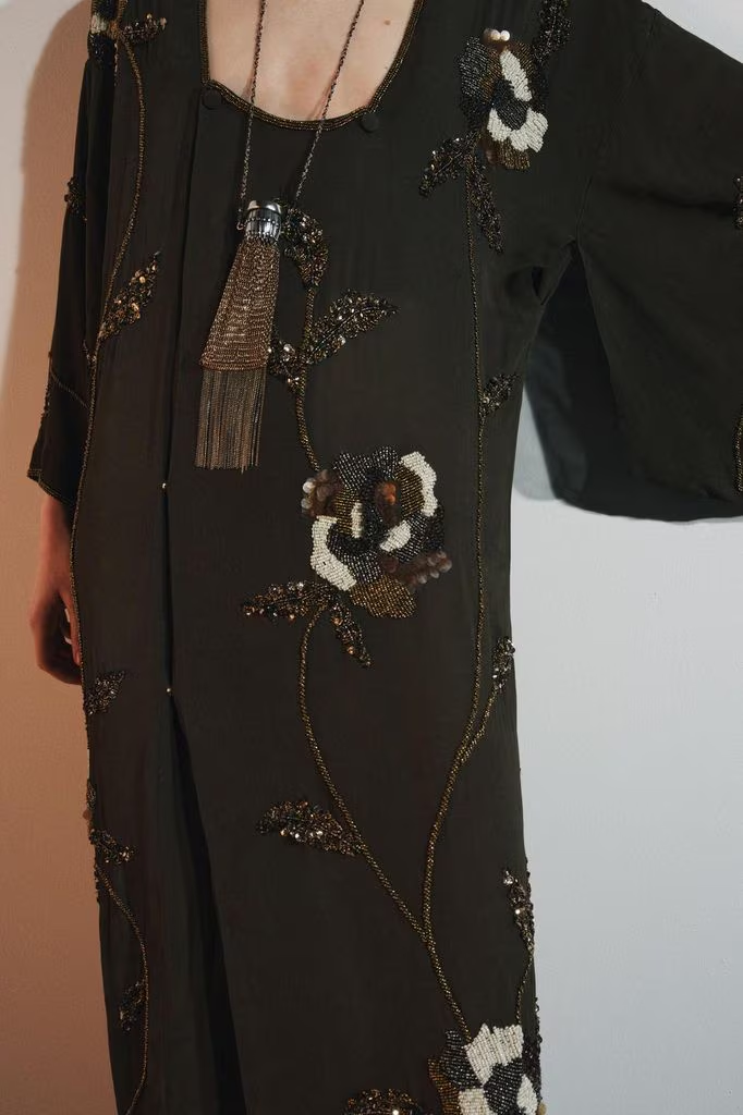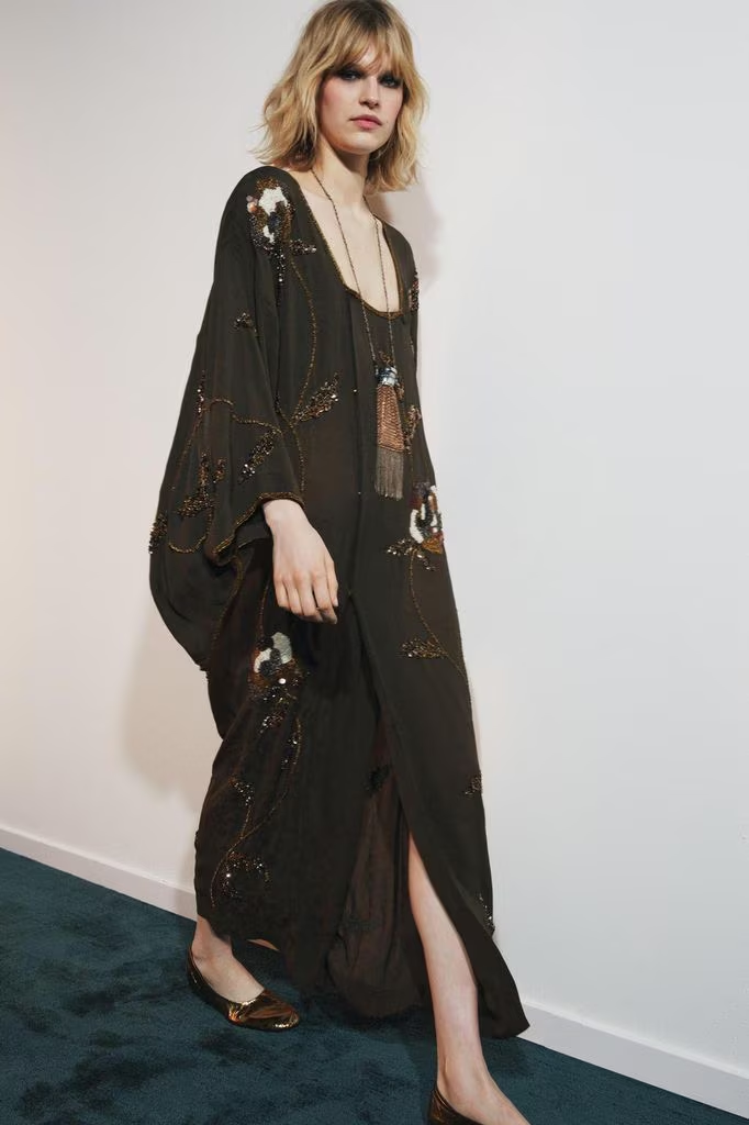 Este es, sin duda, uno de los modelos más especiales de la temporada. De estilo kimono, con escote cuadrado y mangas amplias con abertura, se cruza en la parte frontal con botones ocultos. Lo que realmente lo distingue son los bordados joya que recorren todo el diseño. Al ser amplio, puedes añadir capas debajo y dejarle todo el protagonismo, como una combinación o un vestido ligero tipo slip-dress.