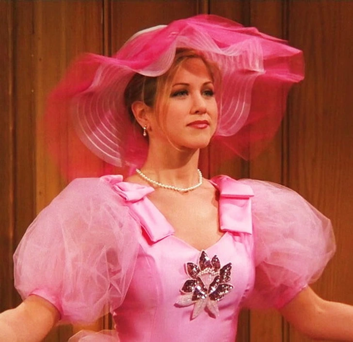 En uno de los capítulos, Rachel acepta ser dama de honor en la boda de su ex. Su vestido —una pieza voluminosa de tafetán rosa con sombrero a juego— se convirtió en uno de los atuendos más comentados (y criticados) de la serie. No es para menos: es un auténtico sueño cursi. La propia Rachel lo describió como “del color de un medicamento contra las náuseas”, y la diseñadora admitió que era espantoso desde el tono hasta el corte. Eso sí, imposible olvidarlo.