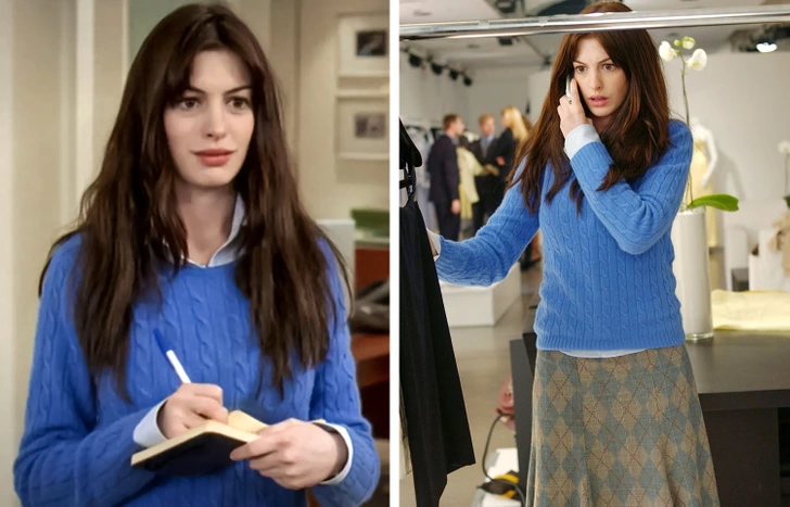 Andy entra a trabajar en una revista de moda sin tener la menor idea del sector, lo que se refleja en sus jerséis holgados y camisas desaliñadas. Su look subraya lo fuera de lugar que está en la industria. El problema es que vive en Nueva York, no en una isla remota. Resulta poco creíble que, con tantas ganas de progresar, no pusiera más empeño en su vestuario. Aun así, ese contraste extremo solo sirve para que su transformación posterior resulte todavía más impactante.