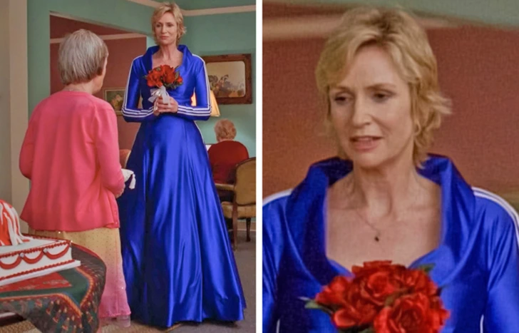Sue Sylvester, la estricta entrenadora, vive prácticamente dentro de un chándal. Su punto culminante: un vestido hecho del mismo tejido deportivo. Una elección tan absurda como inolvidable.