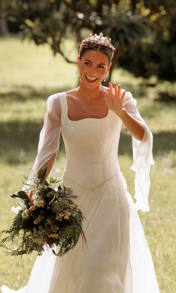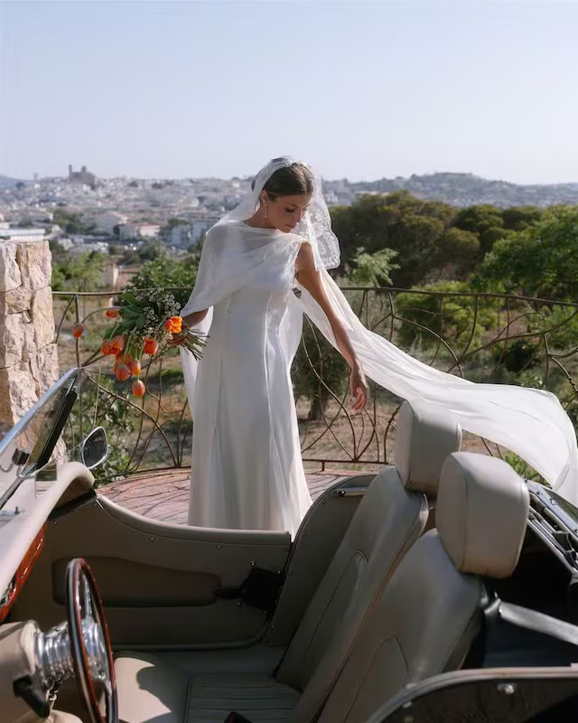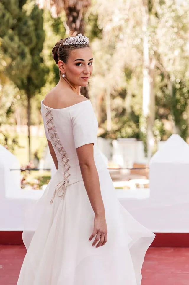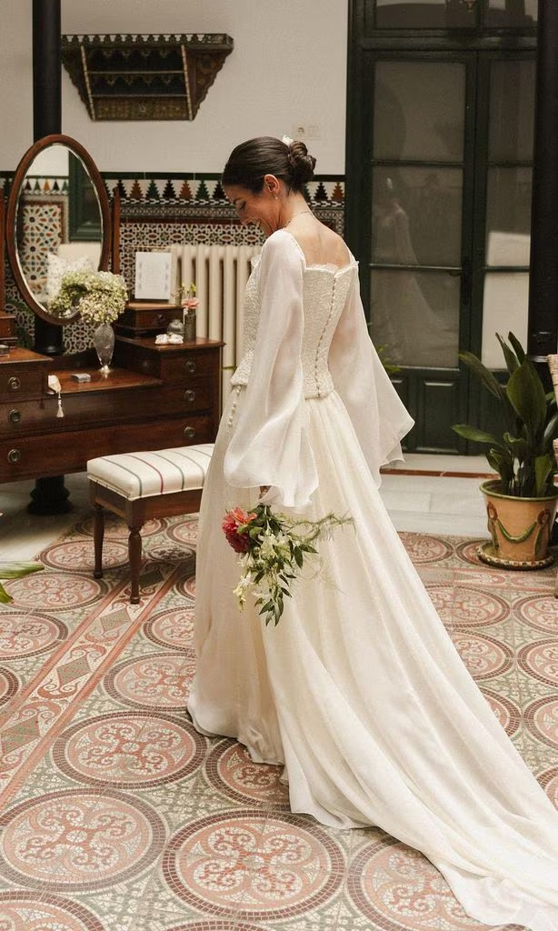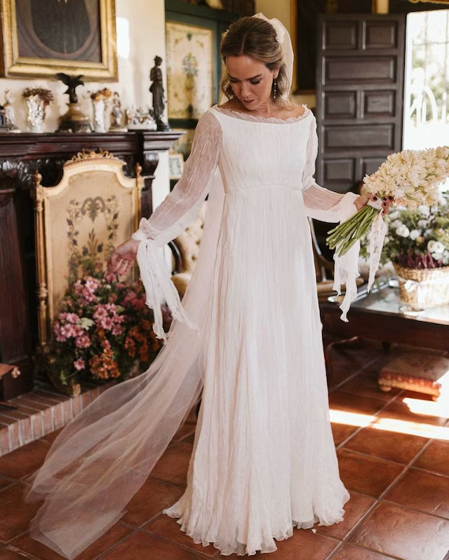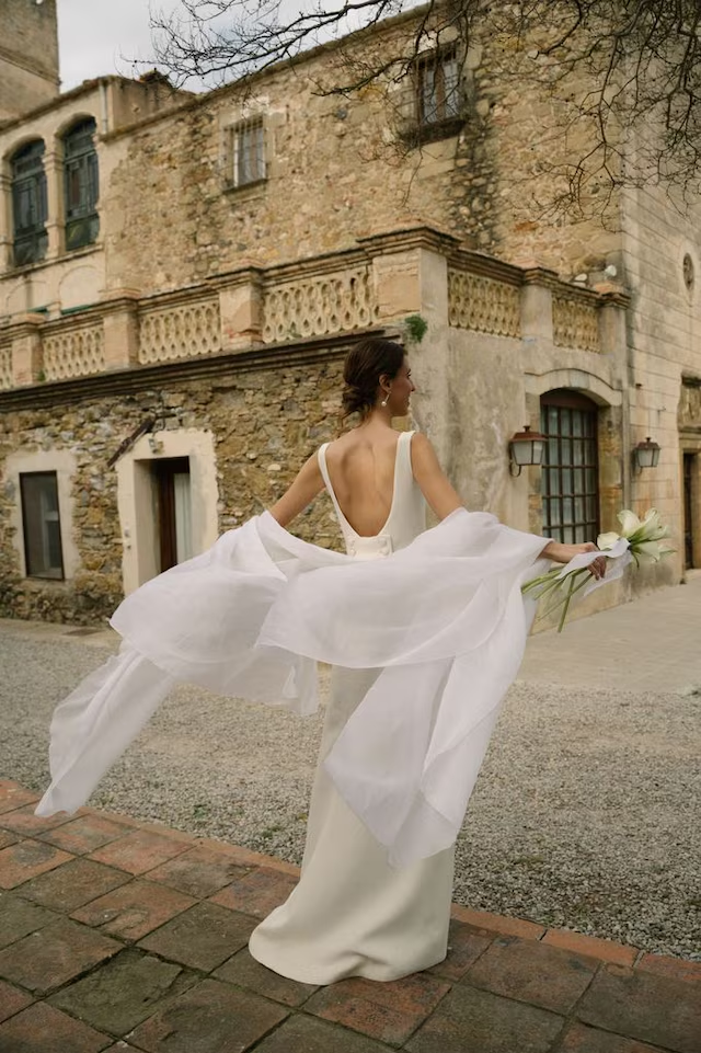 Las capas se reinventan: más sueltas, ligeras y con efecto chal. Ideales para novias que desean una espalda impactante sin recurrir a una cola tradicional.