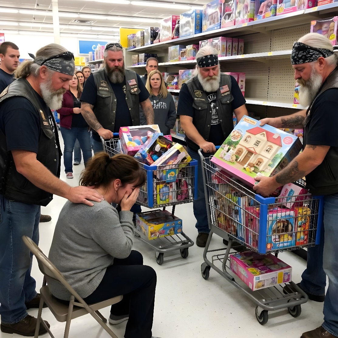 Al principio nadie entendía qué estaba pasando. Pero cuando cuarenta hombres con chalecos de cuero se dispersaron por los pasillos llenando carritos con muñecas, juegos de construcción, sets de manualidades, peluches y juegos de mesa — el aire en la tienda cambió. Se volvió más silencioso, más cálido, más humano.