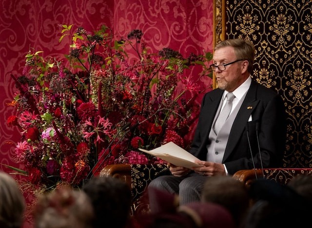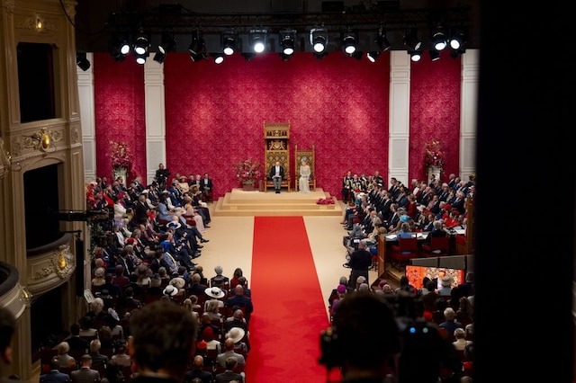 Ya en el Teatro Real, el rey pronunció el tradicional Discurso del Trono, en el que expuso las principales líneas de acción del gobierno para la próxima legislatura. Después, la comitiva regresó al Palacio Noordeinde, desde cuyo balcón la familia real saludó a los neerlandeses en torno a las dos de la tarde. El clima no acompañó del todo, con cielos nublados y viento durante la mañana.