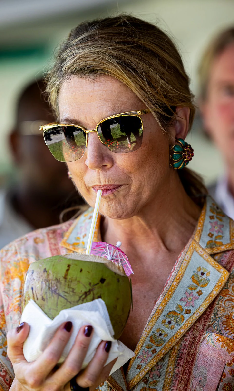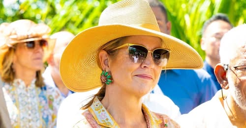 La mañana del 2 de diciembre comenzó entre palmeras en Paramaribo, capital de Surinam. Para esta jornada, la Reina repitió un vibrante vestido amarillo de Natan, que combinó con sus salones nude de Gianvito Rossi, un turbante a juego de Fabienne Delvigne y un nuevo broche con forma de flor.