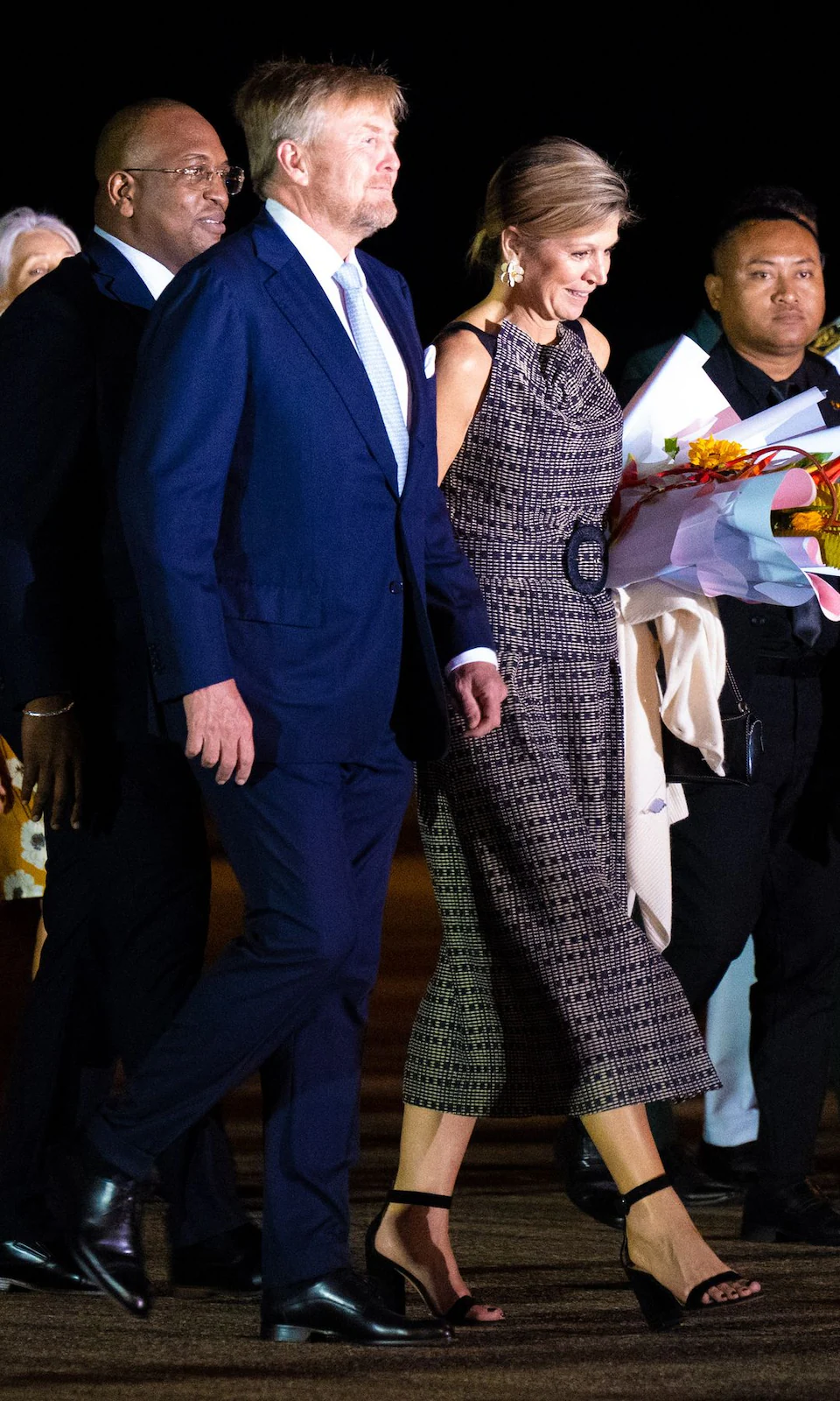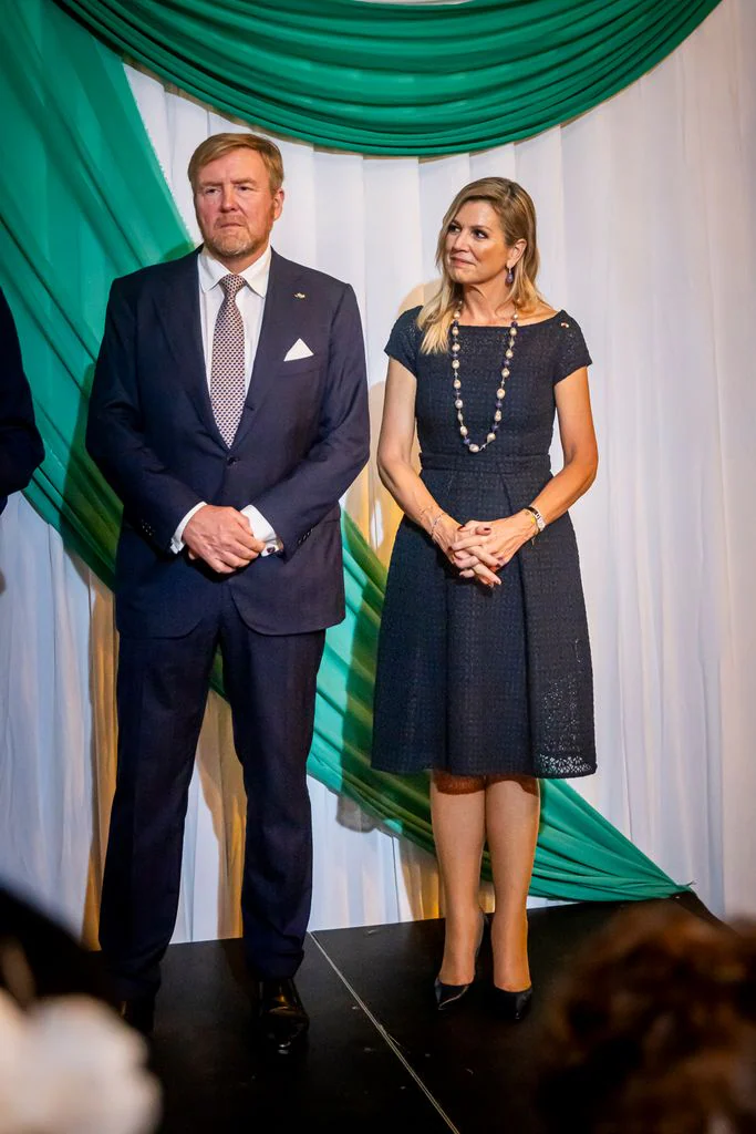 Como broche final a su visita a Surinam, los Reyes ofrecieron una recepción a la comunidad neerlandesa residente en el país. Para esta cita, Máxima de los Países Bajos estaba radiante con un vestido azul marino calado, con escote barco, cintura ceñida y falda acampanada de largo midi. Este diseño de Natan no es nuevo: lo lució por primera vez en 2016. Lo combinó con unos salones a juego de Gianvito Rossi.