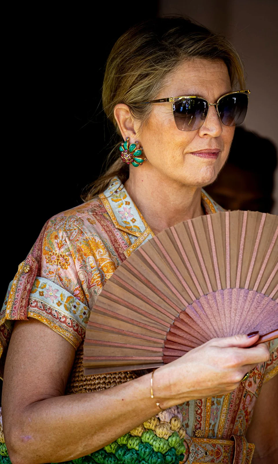 Además de llevar siempre a mano su abanico, Máxima de los Países Bajos rescató sus gafas de montura dorada de Cartier, que tiene desde 2022. Merecen una mención especial sus nuevos pendientes, de piedras de colores y forma floral: una joya totalmente acorde con los diseños que mejor definen el estilo personal de la Reina.