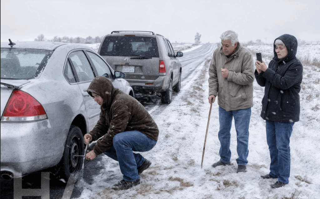 En pantalla apareció una foto —probablemente la que tomó la mujer mientras yo apretaba las tuercas—. Salía yo, inclinado junto a la rueda, con nieve sobre los hombros.