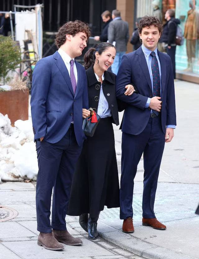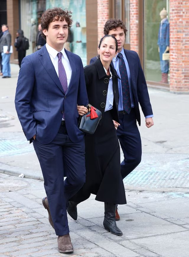 Patricia Cristina, la segunda hija de Carolina Herrera, llegó al desfile del brazo de sus dos hijos. Los tres apostaron por estilismos coordinados en tonos azules. Gerrit y Magnus lucieron trajes clásicos azul marino con camisas azul claro y corbatas de topos, un conjunto sobrio y elegante que encajó a la perfección con el ambiente del evento. Su madre optó por una chaqueta corta de paño, camisa de rayas azules y blancas, falda midi y botas altas, un look que reflejaba la estética refinada característica de la familia.