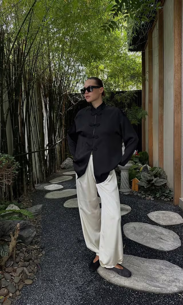 Cuando la ocasión exige un plus de sofisticación, el satén entra en escena, y no hay mejor manera de lucirlo que abrazando la inspiración oriental. Si de por sí la mandarine jacket ya transmite elegancia, en versión satinada eleva cualquier estilismo nocturno a otro nivel. Este diseño tendencia potencia ese aire clásico y old money que, combinado con colores como blanco o negro, da como resultado un outfit refinado y atemporal.