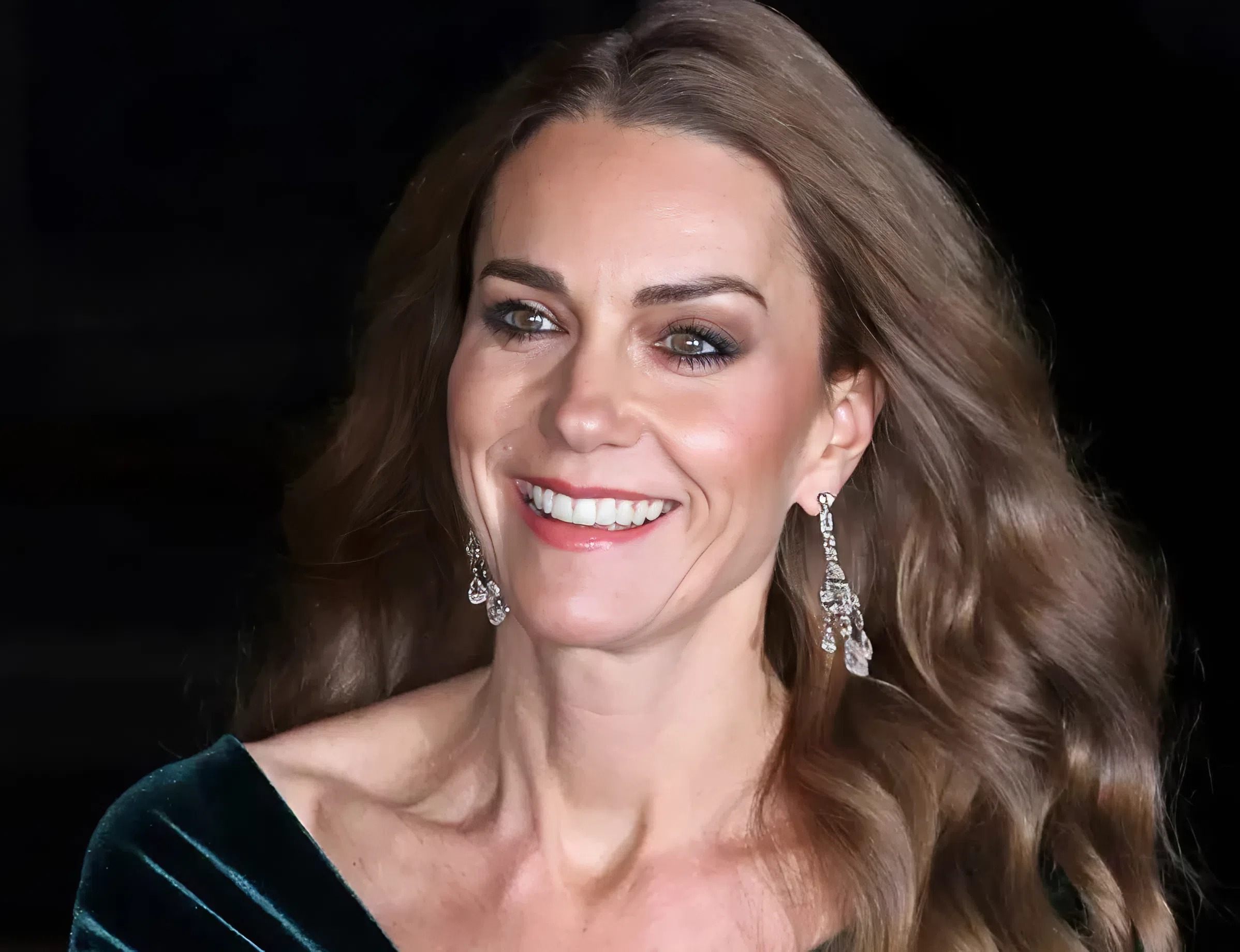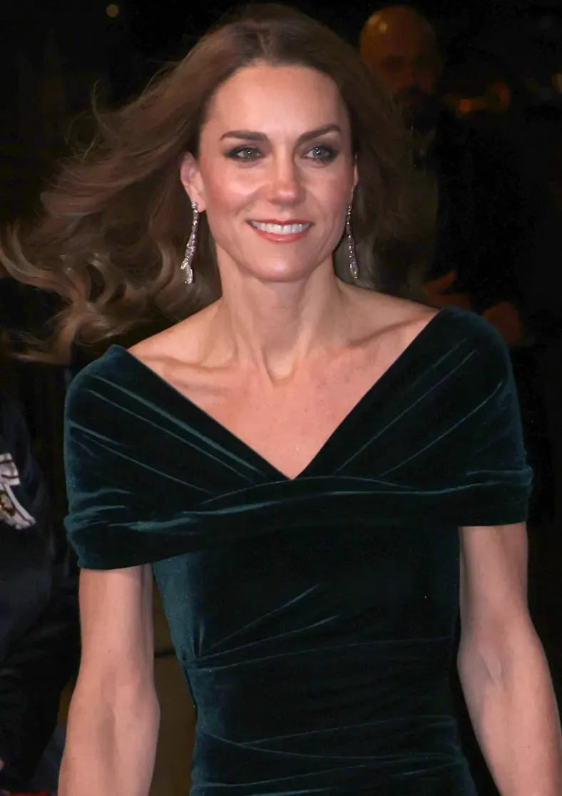 Hace poco, la princesa apareció junto a su esposo, el príncipe Guillermo, en una gala benéfica. Para esta salida eligió un vestido de terciopelo en un intenso tono verde oscuro. El look se completaba con unos pendientes de diamantes y las clásicas ondas sueltas de Kate.