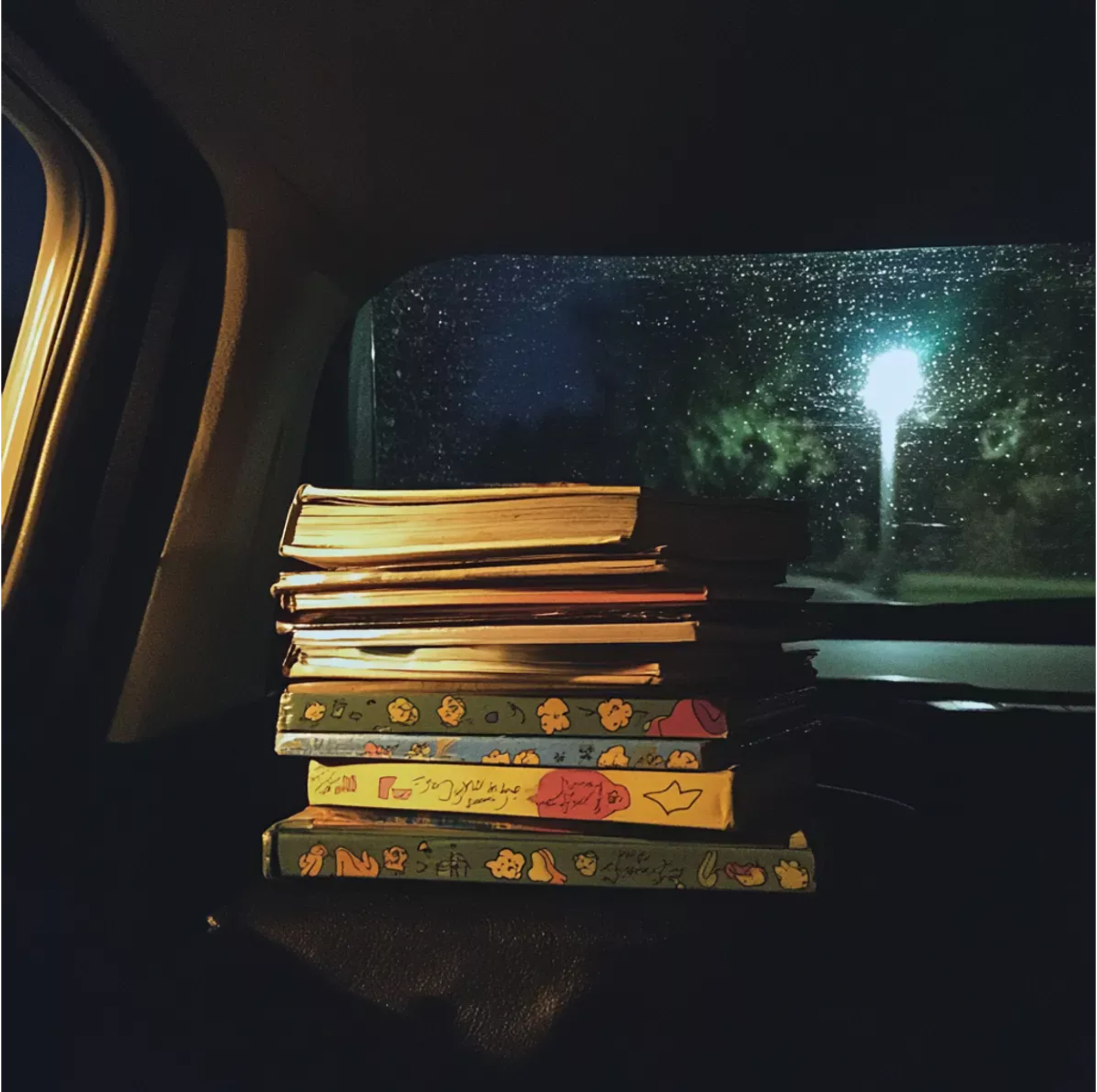 Me miró, luego se estiró en el asiento trasero y sacó una pequeña pila de libros y una grabadora.