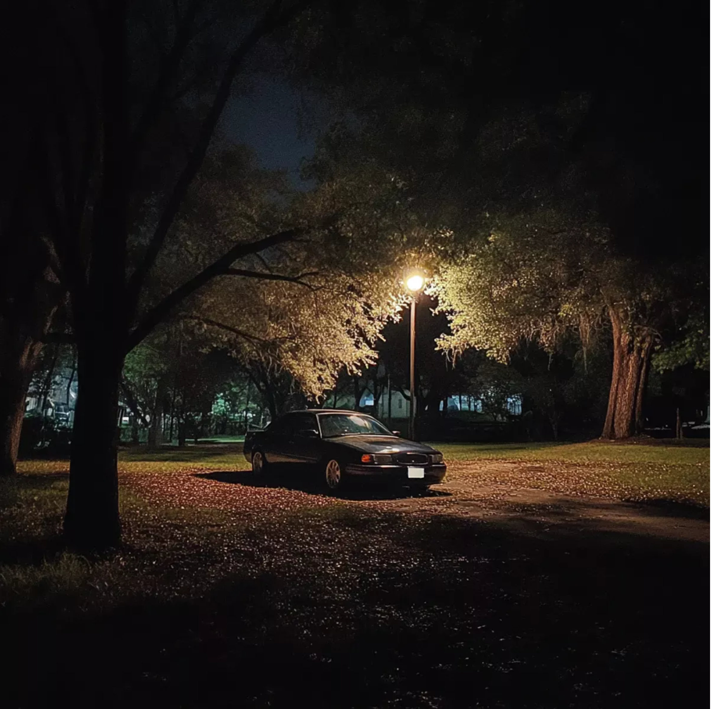 No fue muy lejos. Solo hasta el parque local, donde se detuvo bajo un árbol y apagó los faros.