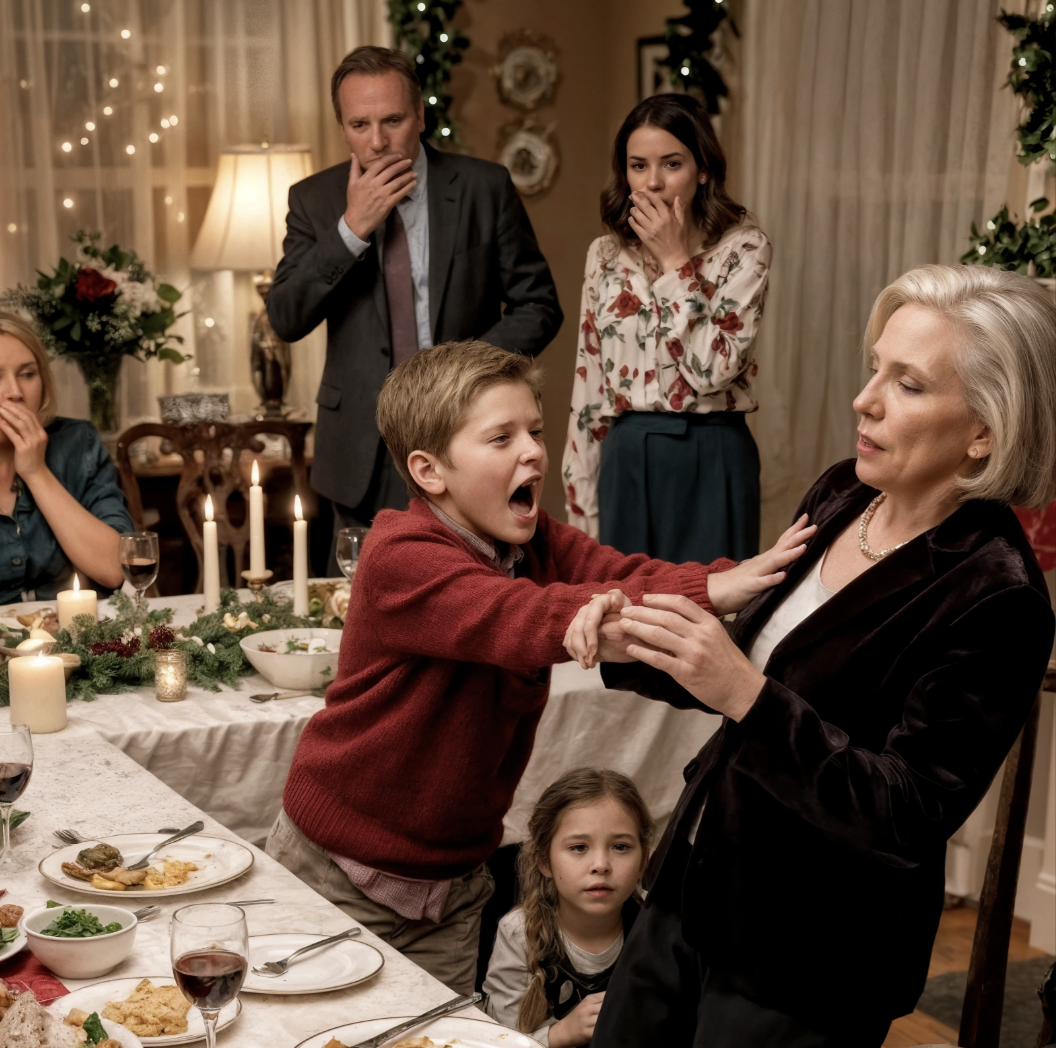 Nunca olvidaré el sonido de la mano de mi suegra al caer sobre la cara de mi hija de cinco años en aquella cena de Navidad. Ese golpe seco resonó en el comedor perfectamente decorado como un disparo, mientras veinte miembros de la familia seguían comiendo su jamón glaseado, fingiendo que nada había ocurrido. Pero lo que dijo mi hijo de ocho años inmediatamente después heló la sangre de todos en la mesa y destapó un secreto que destruyó nuestra familia para siempre.