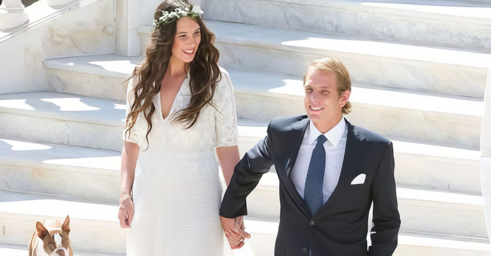 Su look nupcial también destacó por los accesorios. En lugar de los clásicos tacones, optó por unas sandalias planas plateadas, similares a las que solía usar en su día a día. Completó el conjunto con una corona de flores blancas y verdes de inspiración hippy, que acompañó con su melena suelta y ondas suaves. Una elección natural y desenfadada, muy distinta a la de otras novias de la familia Grimaldi.