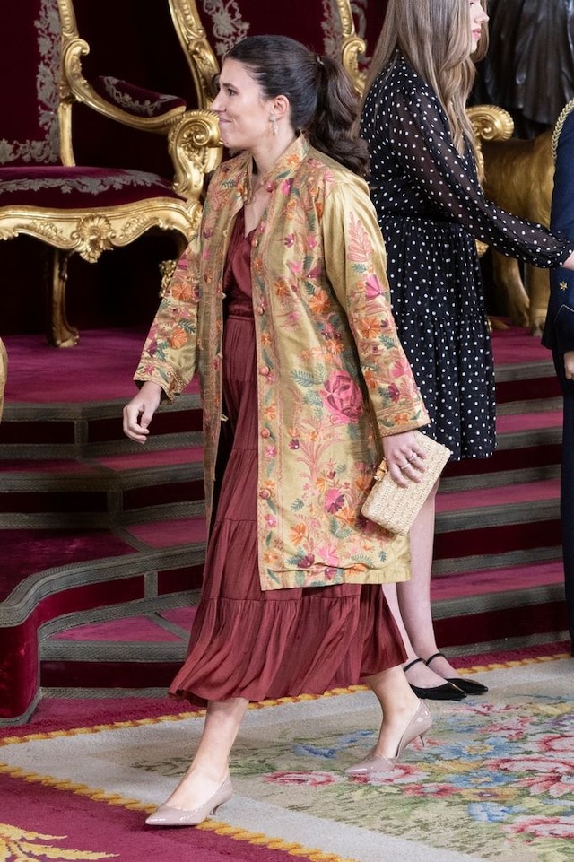 En el besamanos de los Reyes celebrado en el Palacio Real, Urquijo apostó por un look de inspiración oriental, destacando un kimono bordado en tonos dorados combinado con un vestido midi burdeos de corte clásico, acorde con la estética otoñal. Completó el conjunto con zapatos de tacón, un bolso de mano de rafia y una coleta sencilla, una elección que equilibró elegancia y sobriedad. La mezcla de texturas, colores y referencias culturales aportó un matiz original dentro del estricto protocolo de la jornada.