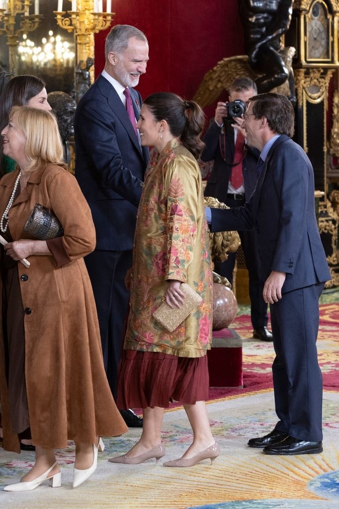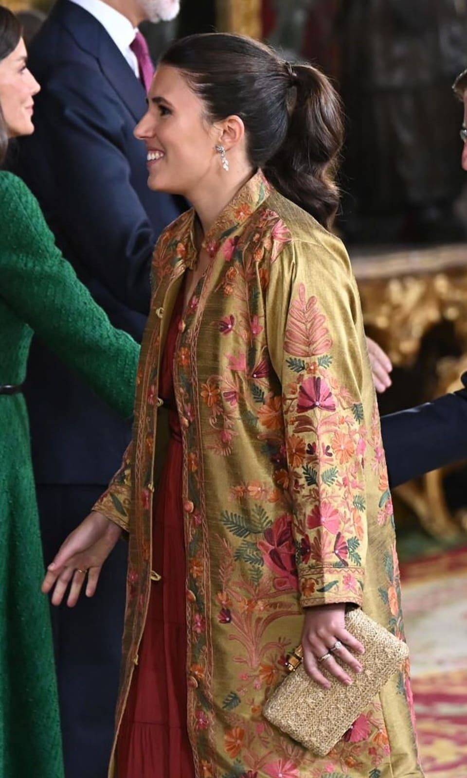 En el besamanos de los Reyes en el Palacio Real, Teresa Urquijo apostó por un kimono bordado de inspiración asiática en tono dorado, combinado con un vestido midi burdeos de corte clásico, muy acorde a la estación. Remató con salones, bolso de mano de rafia y una coleta sencilla, respetando la formalidad del acto. La elección de tejidos, gama cromática y referencias culturales aportó un matiz diferencial dentro del protocolo, coherente con las apariciones de figuras del entorno político y social de la capital.