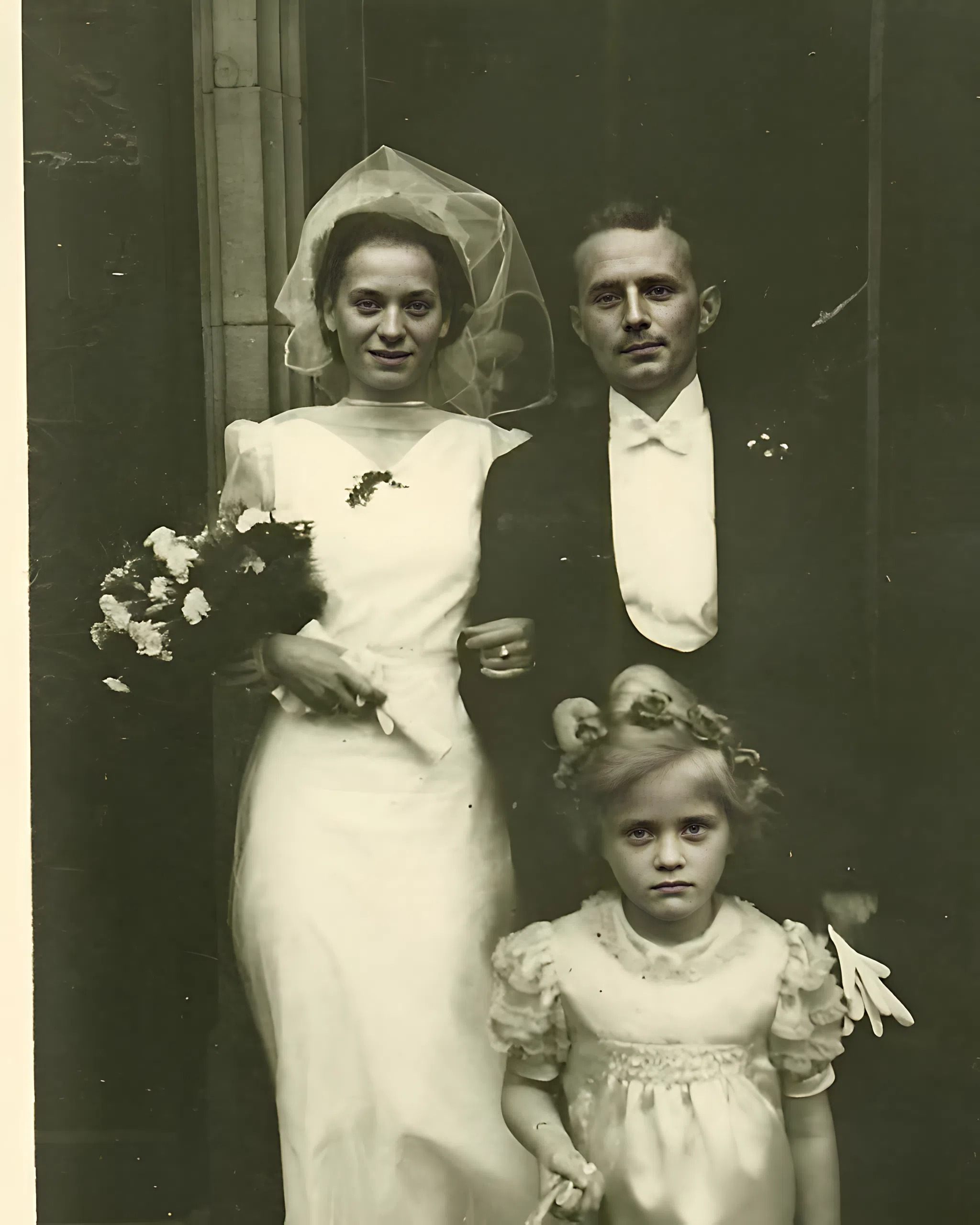 Mientras que la pareja parecía orgullosa, tal vez incluso aliviada, ella miraba directamente a la cámara, como si supiera algo que los demás ignoraban. Una mirada extraña para una niña con flores. Como si no debiera estar allí.