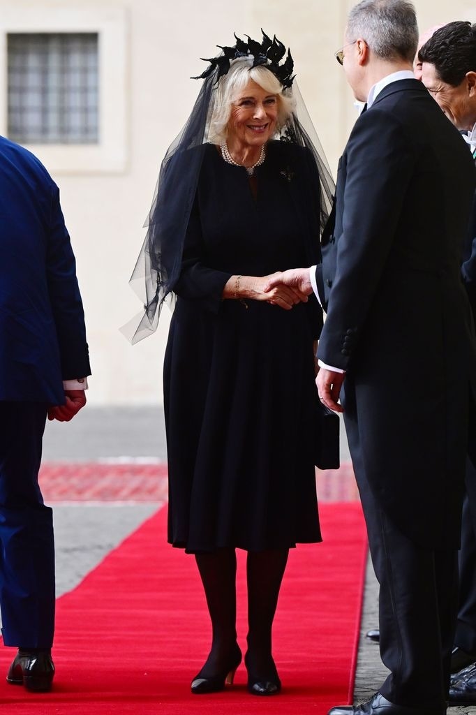 La Reina británica visitó el Vaticano junto a su marido con un estilismo que, pese a ser negro, resultó todo menos discreto o clásico. Para acompañar su vestido de manga francesa, cuerpo ajustado y falda midi con volumen, de Fiona Clare, eligió un llamativo tocado en forma de corona firmado por el sombrerero favorito de la realeza, Philip Treacy. Decorado con motivos que evocan hojas y rematado con un velo de tul que cae por la espalda, recuerda a una “corona triunfal” como las de laurel de la Antigüedad clásica.