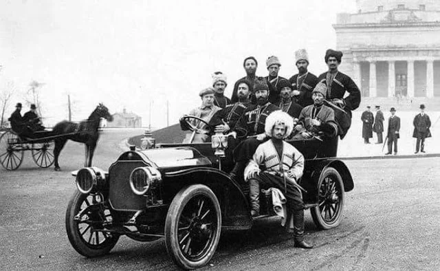 Guerreros del Cáucaso con vestimenta tradicional junto a un automóvil moderno. Esta fotografía fue tomada a comienzos del siglo XX.
