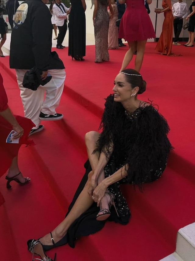 “¿Red carpet o rest carpet?”, escribió con ironía, acompañando una imagen en la que aparece sentada en las escaleras de terciopelo rojo para poder descansar.