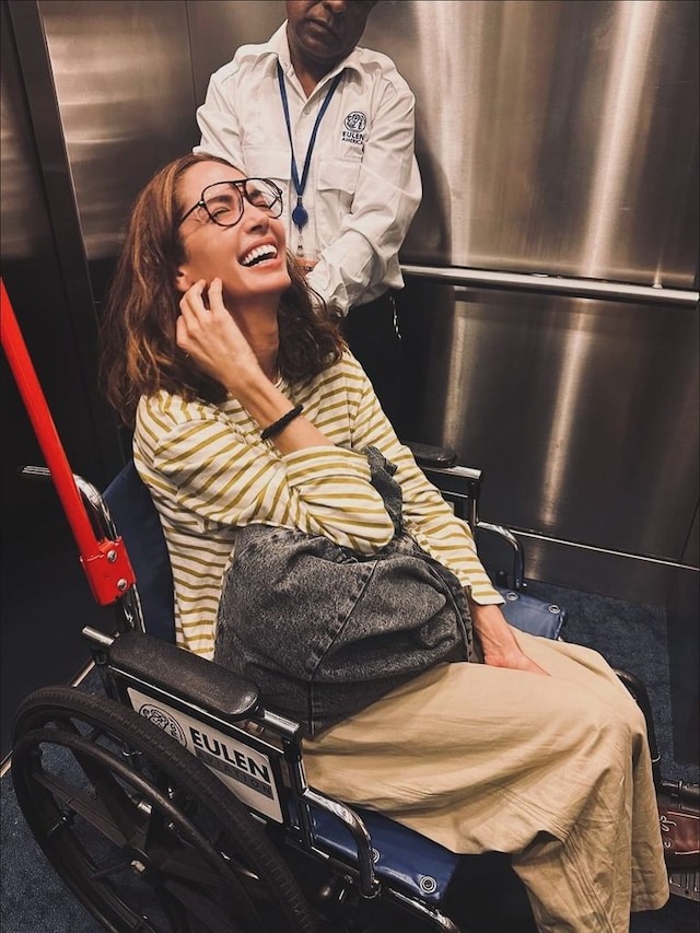 Con su característico sentido del humor, Eugenia compartió una imagen en la que aparece sentada en una silla de ruedas dentro de un ascensor, acompañada del comentario: