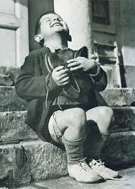 Un niño austríaco se alegra por un nuevo par de botas, Segunda Guerra Mundial.