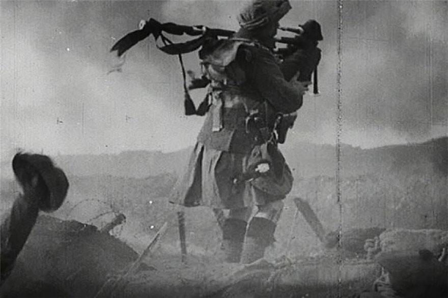Un gaitero escocés con kilt en el campo de batalla, Primera Guerra Mundial.