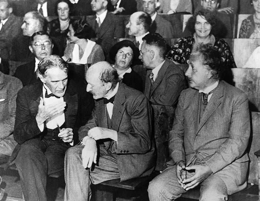 El físico Robert William Wood, el fundador de la física cuántica Max Planck y Albert Einstein sentados en la primera fila en una reunión de la Sociedad Física de Berlín, 1931.