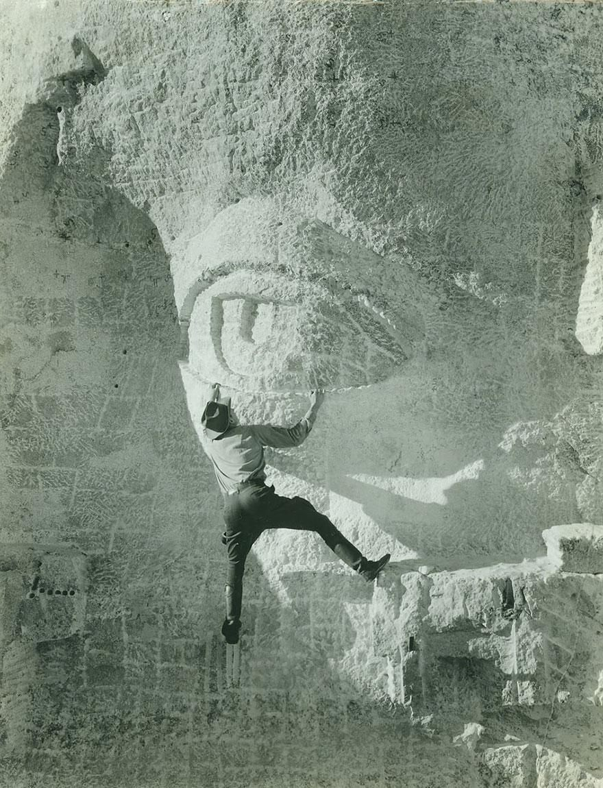 Un hombre talla el ojo de una de las esculturas del monte Rushmore, años 1930.