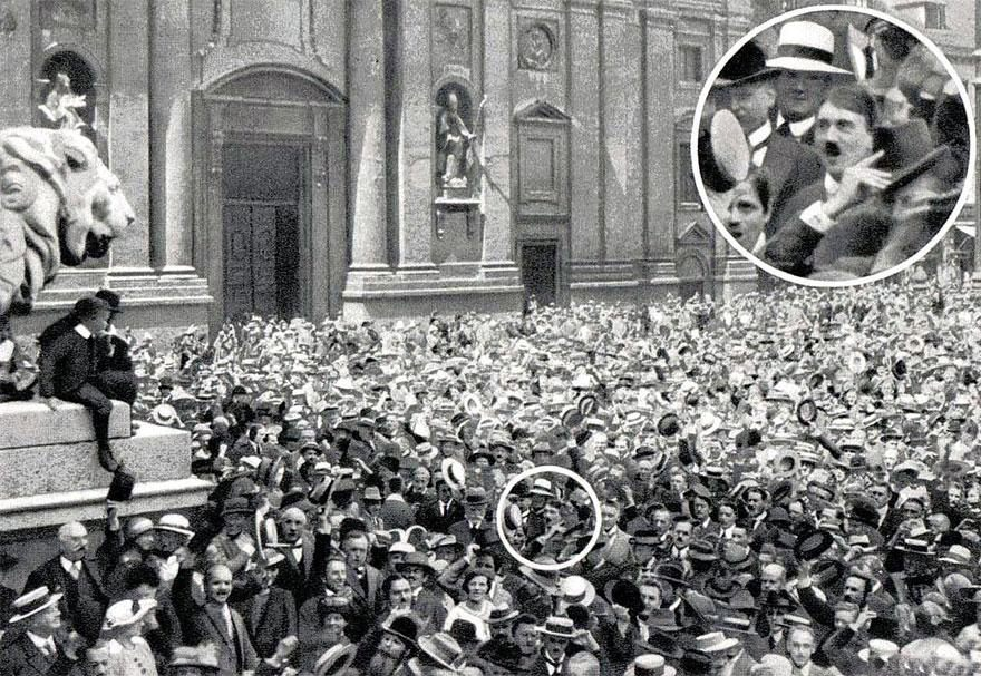 El joven Hitler celebra la noticia del inicio de la Primera Guerra Mundial, 1914.