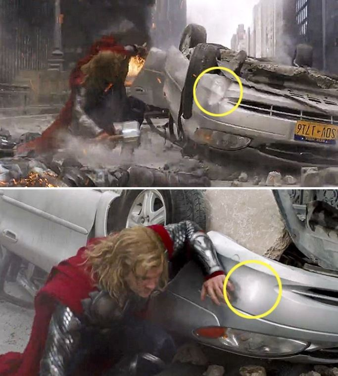 «Los Vengadores», primera parte. Todo se derrumba, hay escombros y polvo por todas partes, y también un coche abollado que, en la escena con Thor, de repente recupera su parachoques. Un milagro, no hay otra.