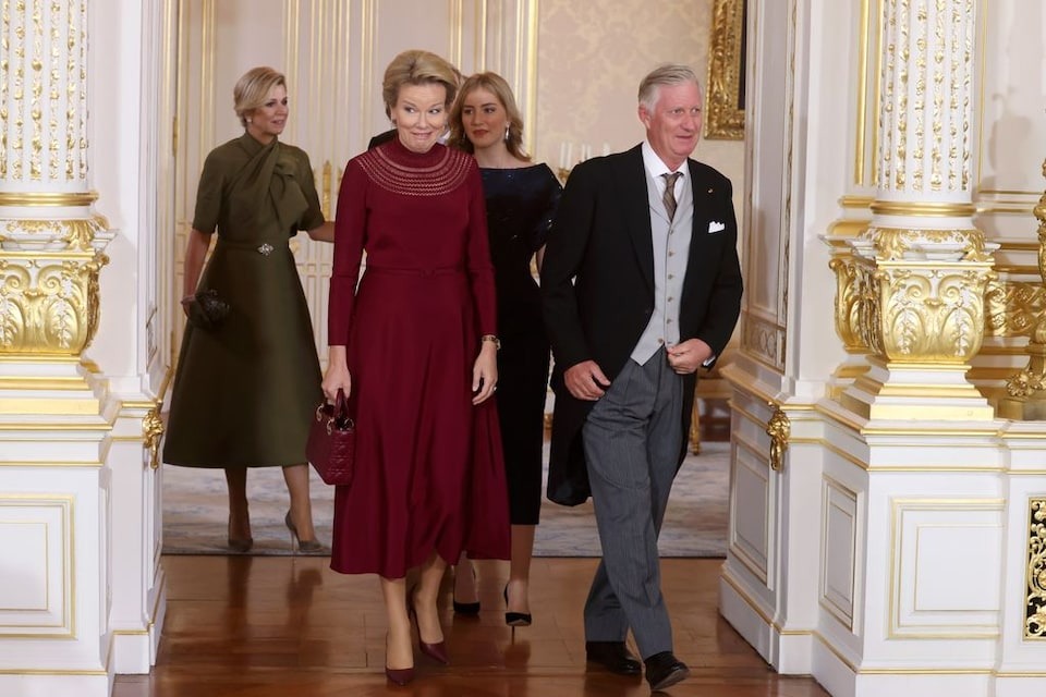 La heredera al trono belga optó por realzar su figura con un vestido azul noche de silueta recta y un escote que recuerda al que posee la reina Letizia de la firma gallega Boüret.
