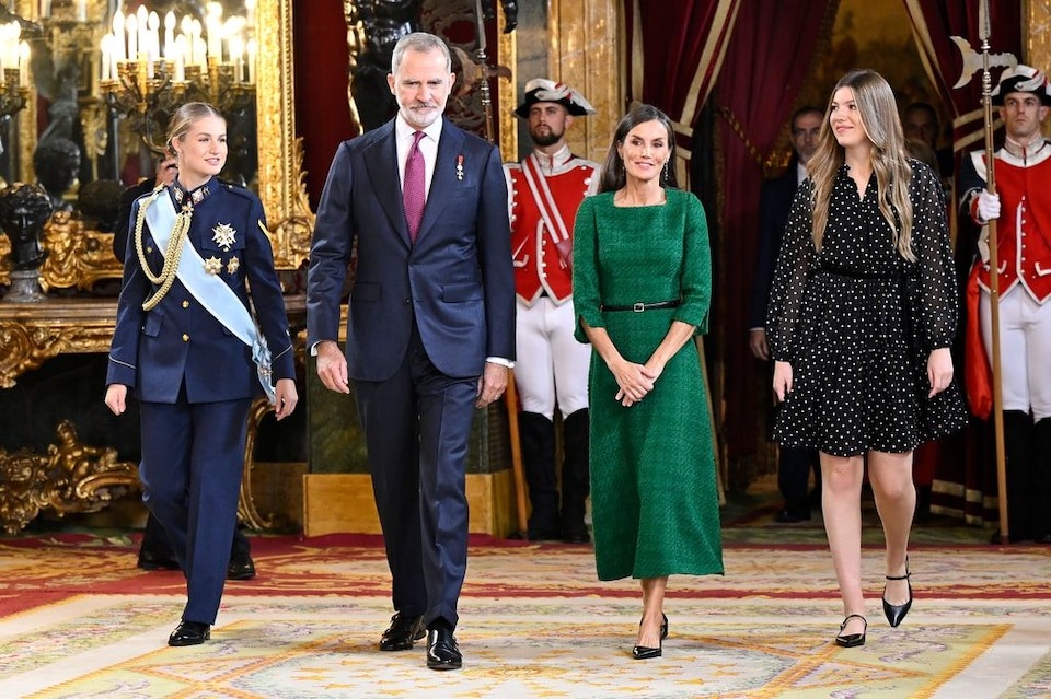 Tras el desfile militar del Día de la Hispanidad, celebrado en el centro de Madrid, los Reyes y sus hijas ofrecieron la tradicional recepción con motivo de la Fiesta Nacional. Esta edición ha sido especialmente significativa, ya que por primera vez la infanta Sofía ha tomado parte en el acto institucional después de haber alcanzado la mayoría de edad el pasado 29 de abril. Además, este año ha podido asistir al desfile militar tras dos años de ausencia, pues al coincidir el 12 de octubre en domingo, pudo desplazarse a la capital.