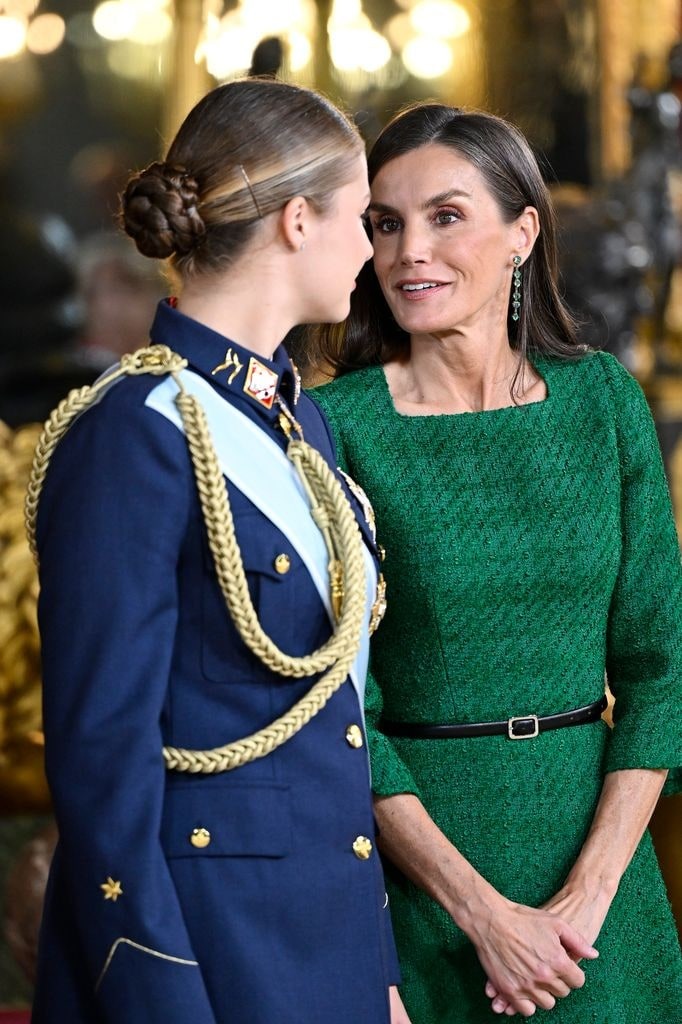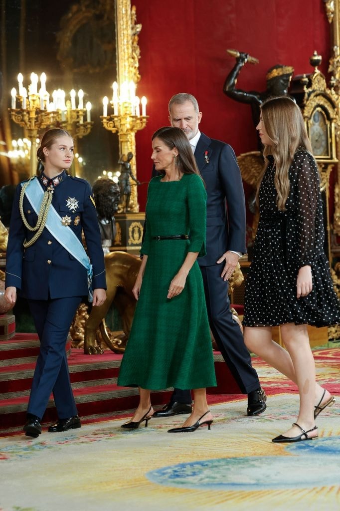 Como es habitual, la princesa Leonor no se ha cambiado de atuendo y ha mantenido su uniforme del Ejército del Aire. Durante el saludo, se ha situado al lado de la Reina, mientras que Sofía ha permanecido junto a su hermana. Entre los asistentes destacaban el alcalde de Madrid, José Luis Martínez-Almeida, acompañado de su esposa, Teresa Urquijo, quien ha realizado una reverencia a la Familia Real. La pareja atraviesa un momento especialmente feliz tras el nacimiento de su primer hijo, Lucas, el pasado verano. También se ha visto a la nadadora Teresa Perales, nombrada marquesa de Perales por deseo del Rey el pasado junio, así como a Paloma Segrelles y al duque de Calabria, Pedro de Borbón-Dos Sicilias.