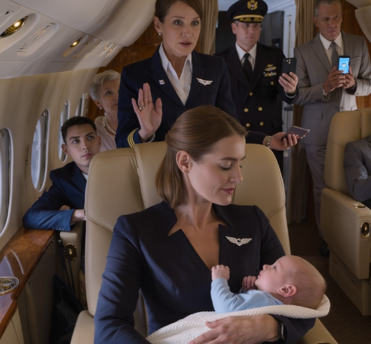Al otro lado del pasillo, la azafata Sandra Mitchell ajustaba su impecable uniforme azul marino. No era una mujer cruel, solo extremadamente cansada: quemada tras una semana de retrasos, reclamaciones y memorandos internos en los que cada línea parecía ocultar una acusación velada contra la tripulación. Al ver al bebé, sus hombros se tensaron de forma automática.