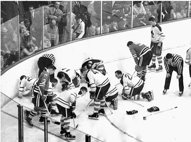 Jugadores de hockey buscan una lente de contacto perdida directamente en la pista durante el partido. Año 1962.
