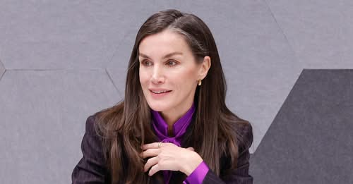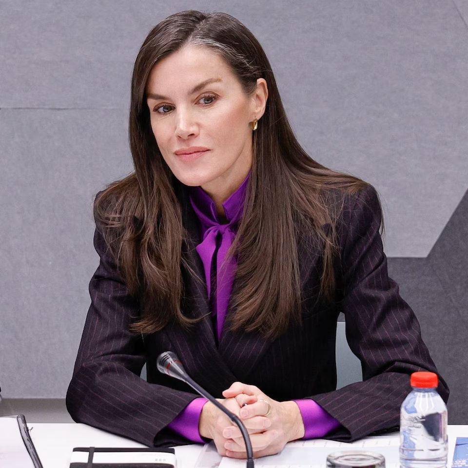 En concreto, luce un conjunto en gris muy oscuro, realzado por una fina raya diplomática en violeta. El sastre se compone de una chaqueta de doble botonadura con bolsillos de solapa y un pantalón muy ancho. Para completarlo, nada mejor que actualizar el look con una prenda que conserva en su armario desde su etapa como princesa de Asturias, reforzando así su compromiso con la sostenibilidad al reutilizar piezas de hace años. Seguro que recuerdas esta blusa morada con lazo de Felipe Varela: la estrenó en 2009, logró con ella uno de sus mejores estilismos en 2011 y, además, propició que se comparara el estilo de Kate Middleton con el suyo, ya que poco después la británica luciría una muy similar.