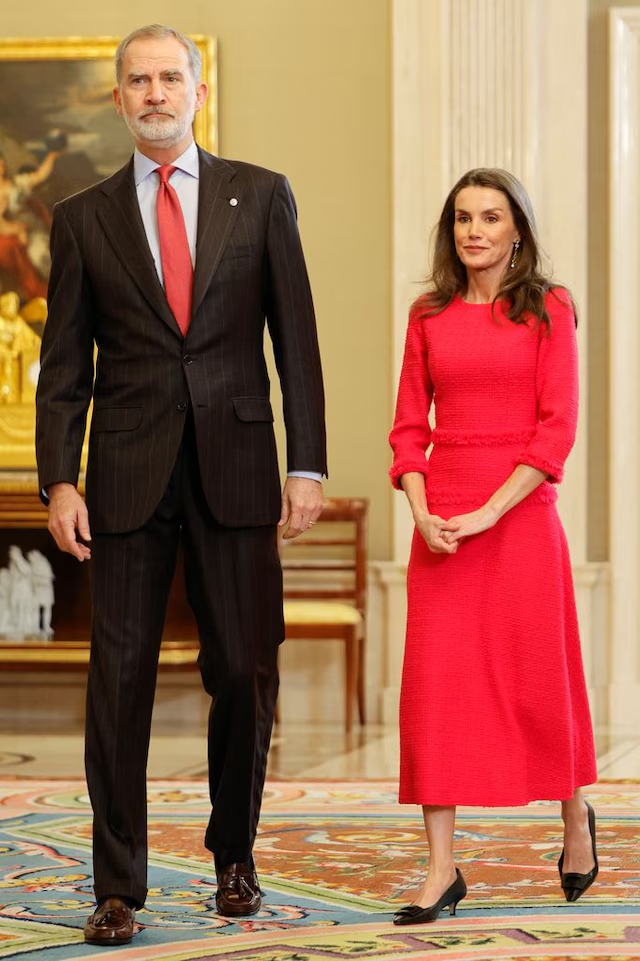 El tweed, tejido que Coco Chanel popularizó en los años 20 y que hoy continúa siendo símbolo de elegancia clásica, ocupa un lugar destacado en el vestidor de doña Letizia. La Reina suele apostar por esta textura en momentos relevantes. Así ocurrió, por ejemplo, durante la celebración del Día de la Hispanidad el 12 de octubre de 2025, cuando estrenó un vestido en tono verde. Al igual que el que luce hoy, tampoco se conoce su firma y se atribuye a los talleres de palacio.