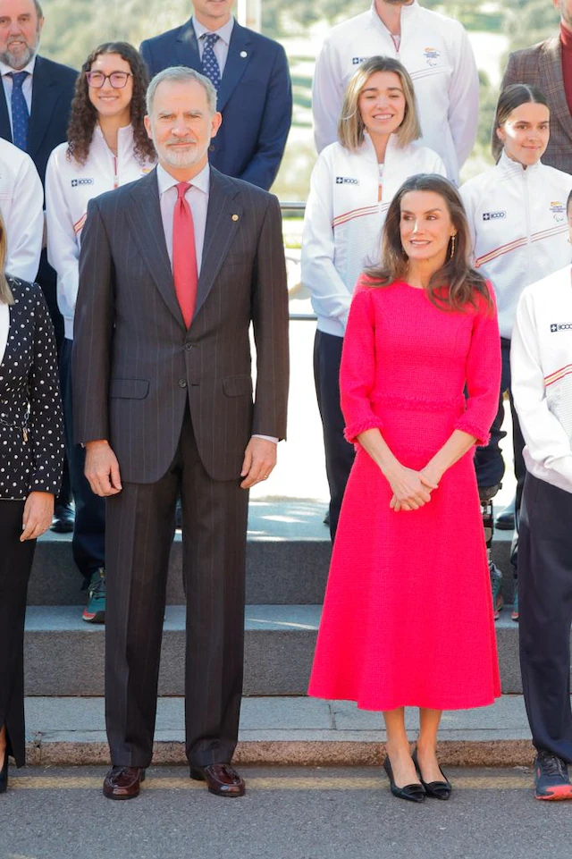 Arranca así la agenda oficial de la reina Letizia en una jornada repleta de actos (el viernes, por ejemplo, viajará al Vaticano para reunirse con el Papa León XIV). La actividad ha comenzado en el Palacio de La Zarzuela con la recepción al equipo paralímpico español participante en los Juegos de Invierno Milano-Cortina 2026. Este encuentro precede a su visita a Jaén, donde se celebran los 1.200 años de su capitalidad y donde recorrerá el Ayuntamiento, la muestra Jaén: 828-2025 y los Baños Árabes. Para la ocasión, la esposa del rey Felipe VI ha rescatado de su armario más reservado un vestido de tweed fucsia, cuya autoría no ha sido confirmada, por lo que podría tratarse de un diseño confeccionado por sus modistas de confianza.