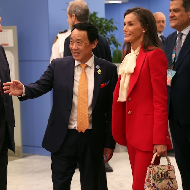 Durante los últimos meses, la Reina ha convertido el traje sastre en su prenda fetiche para los actos oficiales, tanto de día como de noche. En verano, prefiere versiones ligeras y coloridas —en tonos coral o azul—, mientras que en otoño recupera diseños más estructurados y de silueta entallada, como este conjunto rojo compuesto por una blazer ajustada con hombros marcados y pantalón recto, que estiliza su figura.