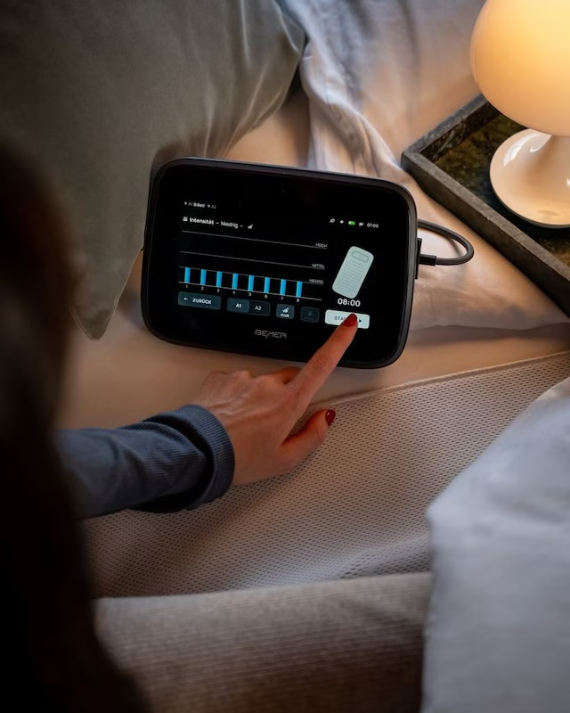 Después del gua sha, Cindy utiliza su BEMER Mat, una esterilla que emite campos electromagnéticos de baja intensidad para estimular la microcirculación. Su objetivo es mejorar la oxigenación celular y facilitar la eliminación de residuos metabólicos.