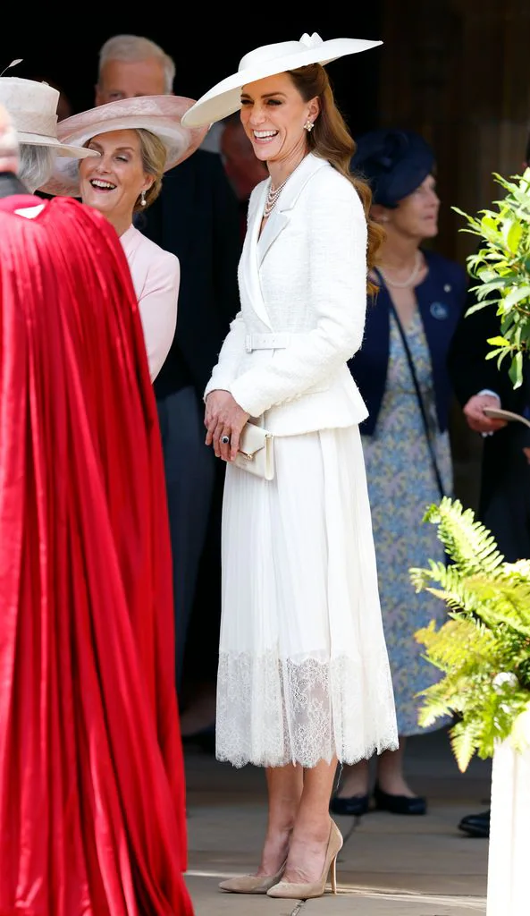Durante su aparición en el servicio de la Orden de la Jarretera, celebrado en la Capilla de San Jorge del Castillo de Windsor, la Princesa de Gales recuperó uno de sus vestidos más icónicos: un diseño blanco de Self-Portrait con falda de encaje, que ya había lucido en citas tan señaladas como el concierto por el 80º aniversario del VE Day o el Jubileo de Platino de 2022.