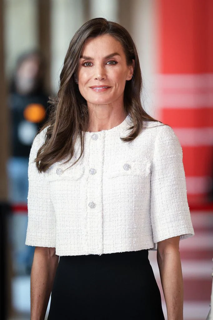 En clave más formal, durante la entrega de los Premios SM de Literatura Infantil y Juvenil, rompió con semanas dominadas por el total black al elegir un top de tweed blanco de Maje, con botones joya y ribetes desflecados, combinado con pantalones palazzo de tiro alto de Sybilla y zapatos de tacón de Carolina Herrera.