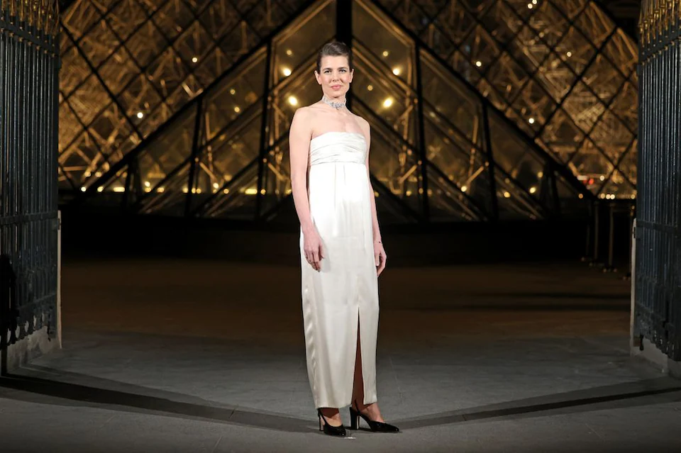 En la primera edición de Le Grand Dîner du Louvre, Carlota Casiraghi apostó por Chanel con un vestido blanco de inspiración nupcial, realizado en crepé de seda, con corte imperio y maxifalda tableada. Lo combinó con un maxiabrigo de tweed, gargantilla de perlas y bolso Mini Square Classic, consolidando una imagen artística y sofisticada ante la pirámide del Louvre.