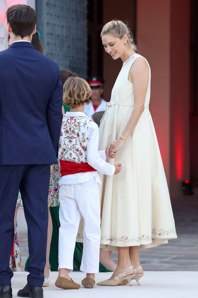 Durante las celebraciones por los 20 años de reinado de Alberto II, Beatrice Borromeo, embarazada de su tercer hijo, lució un vestido blanco de Dior con cuello a la caja, cinta bajo el pecho y delicados bordados florales.