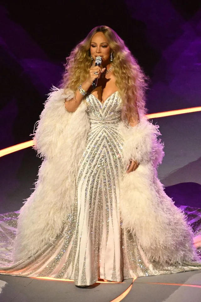 Para la ocasión, Carey eligió un diseño de Roberto Cavalli by Fausto Puglisi, inspirado en el glamour de Hollywood clásico con una lectura contemporánea. El vestido, de inspiración art déco, estaba bordado con cuentas brillantes y cristales de Swarovski, con un efecto de luz espectacular sobre el escenario. Completaba el look una cola fluida y dramática y una estola de plumas de avestruz, que reforzaba la dimensión escénica y el espíritu invernal del evento.