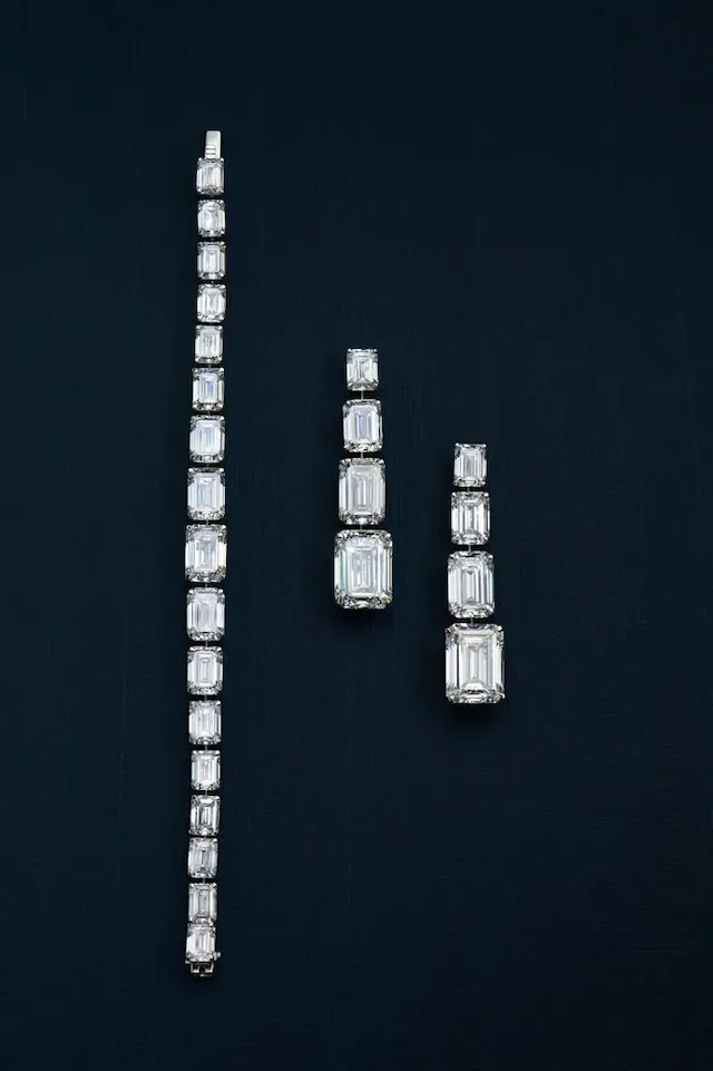El foco se centró en su suite de diamantes de 15 millones de dólares, diseñada por la maison belga Levuma, incluyendo collar, pendientes y pulsera, con más de 306 quilates de diamantes talla esmeralda. El collar contaba con un colgante central de 20 quilates de color D, considerado el máximo estándar de pureza, mientras que los pendientes sumaban 66 quilates y la pulsera completaba el conjunto con 55 quilates adicionales. Ali Khalil, director creativo de Levuma, destacó la importancia de la pieza: “Cada diamante fue seleccionado a mano para reflejar luz y emoción; la mujer que lo lleva es el verdadero foco”.
