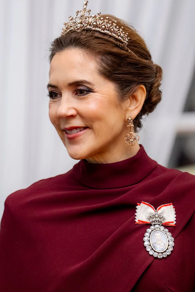 Acompañando este look de estreno, Mary no recurrió al joyero histórico de la Familia Real, como hizo en Estonia, sino que eligió una pieza que ella misma compró: la impresionante tiara adquirida en mayo de 2012 en la casa de subastas danesa Bruun Rasmussen.
