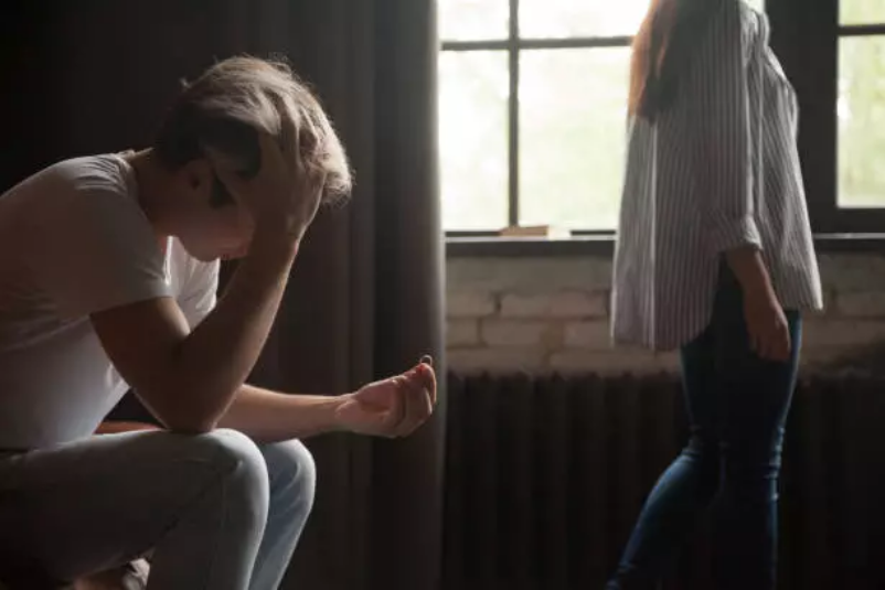 Joven frustrado y triste sosteniendo un anillo de compromiso, esposa o novia abandonando a un marido deprimido y desconsolado, pareja rompiendo, concepto de divorcio, ruptura de relaciones, rechazo de una propuesta de matrimonio